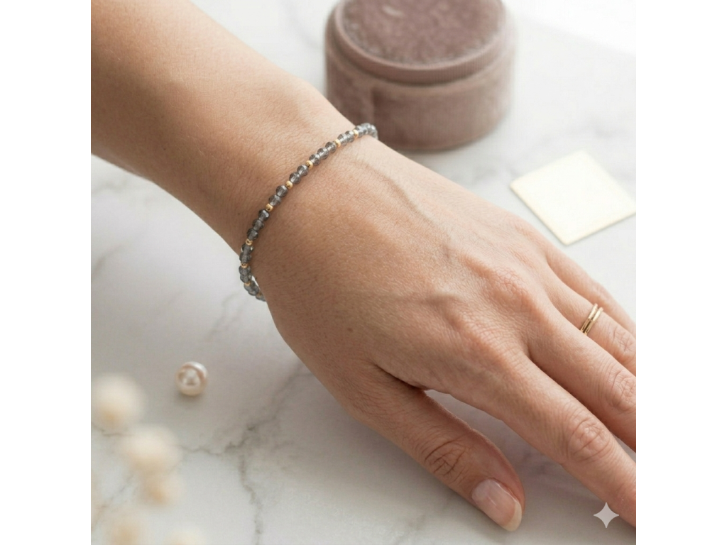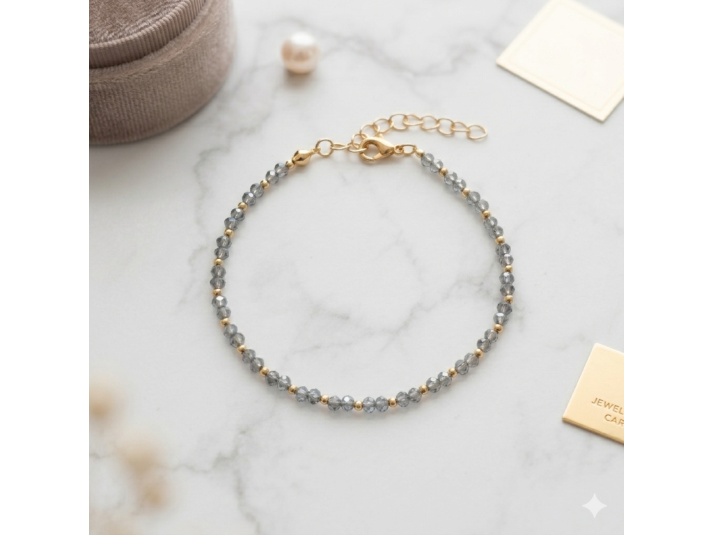Minimalistický náramek, který pro vás s láskou ručně navlékám. Kombinace kouřově šedé barvy (Anthracite) a zářivých zlatých detailů vytváří elegantní šperk pro každou příležitost. Díky precizně broušeným korálkům se náramek krásně třpytí a dodá vašemu zápěstí jemný, ale luxusní šmrnc.
