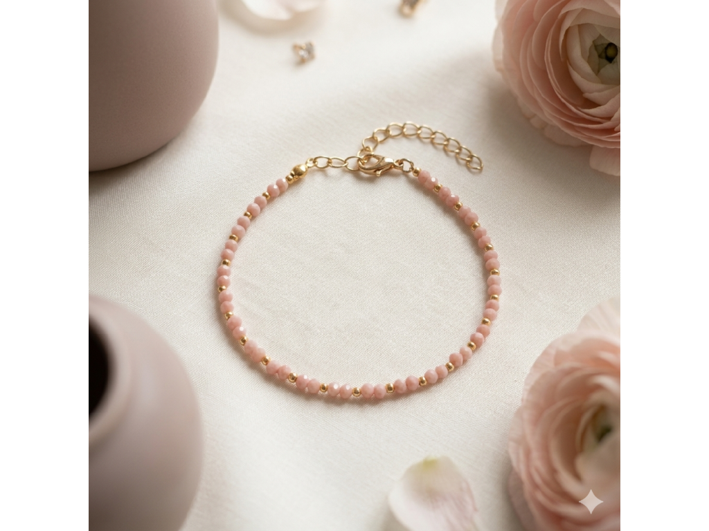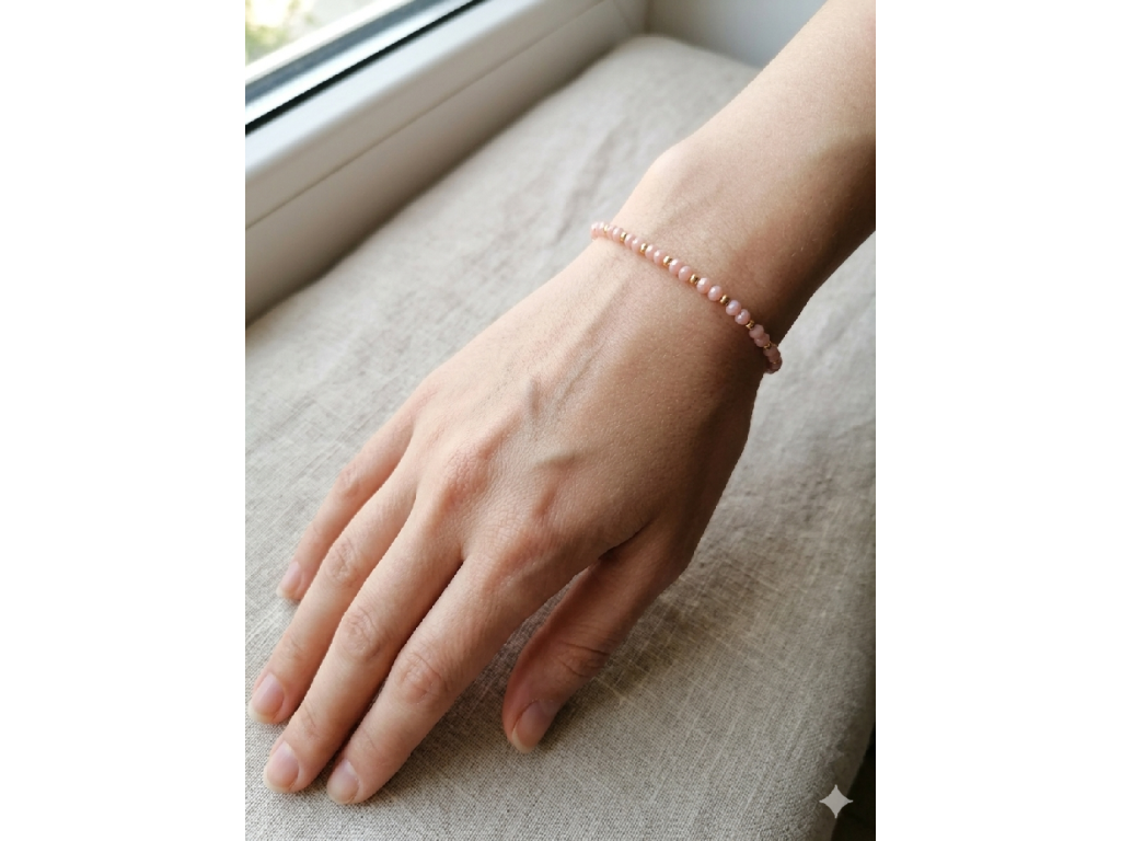 Minimalistický náramek, který pro vás s láskou ručně navlékám. Jemná kombinace světle meruňkové barvy (Apricot) a zářivých zlatých detailů vytváří elegantní šperk pro každou příležitost. Díky precizně broušeným korálkům se náramek krásně třpytí a dodá vašemu zápěstí hřejivý a svěží šmrnc.