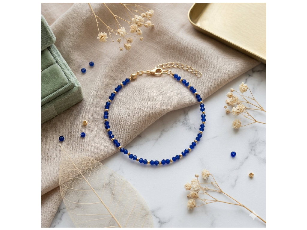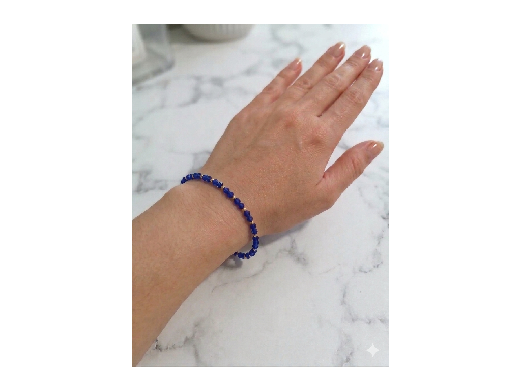Minimalistický náramek, který pro vás s láskou ručně navlékám. Kombinace hloubky královsky modré barvy (Royal Blue) a zářivých zlatých detailů vytváří elegantní šperk pro každou příležitost. Díky precizně broušeným korálkům se náramek krásně třpytí a dodá vašemu zápěstí jemný šmrnc.
