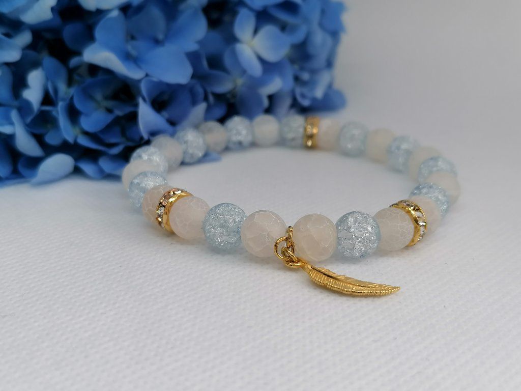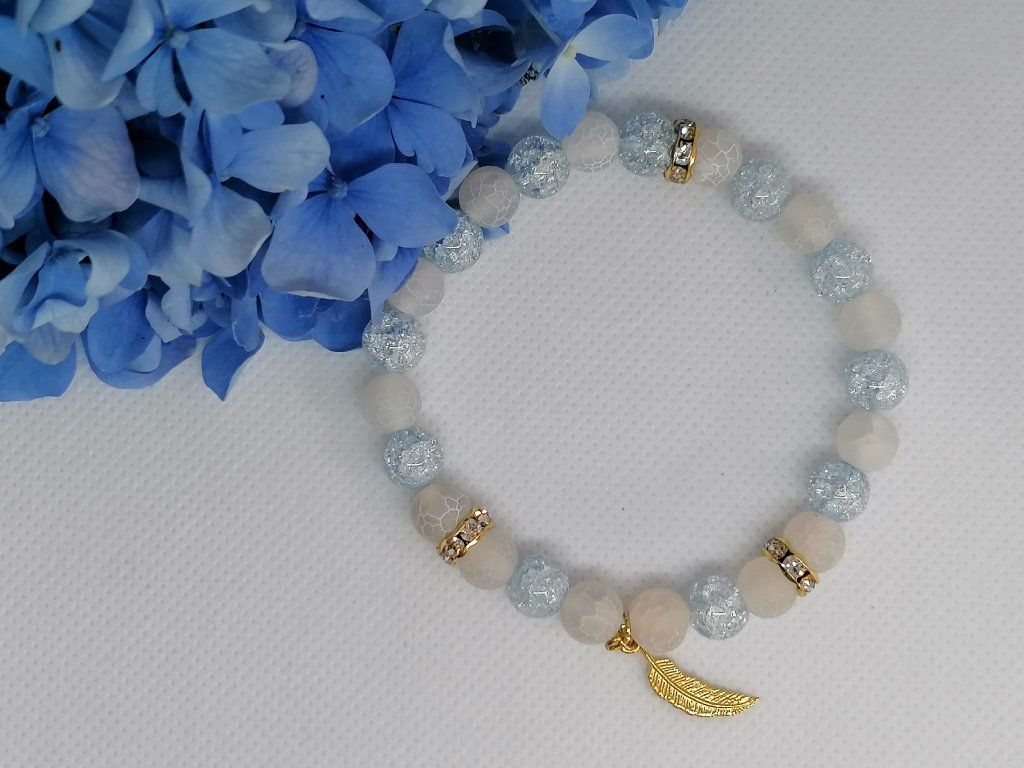 Něžný minerální náramek kombinující jemné odstíny achátu a světle modrého praskaného křišťálu. Tato harmonická souhra barev přináší pocit klidu, čistoty a radosti ze života. Dominantou šperku je přívěsek ve tvaru pírka, který je vyroben ze stříbra Ag 925/1000 a pozlacen 24k zlatem. Náramek doplňují zlaté štrasové rondelky, které podtrhují jeho eleganci. Navlečeno na kvalitní pružence.