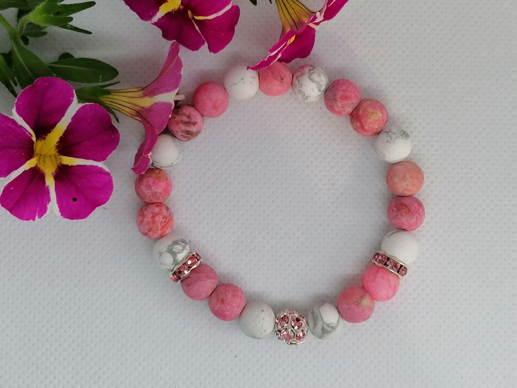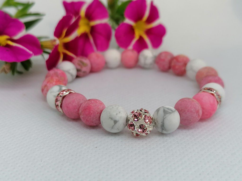 Něžný a energický minerální náramek kombinující sytě růžový achát a sněhobílý magnezit. Tato souhra kamenů přináší citovou rovnováhu, vnitřní klid a podporuje sebelásku. Náramek zdobí stříbrná štrasová kulička a rondelky s růžovými šatony, které mu dodávají oslnivý třpyt a luxusní vzhled. Navlečeno na kvalitní pružence pro pohodlné nošení.