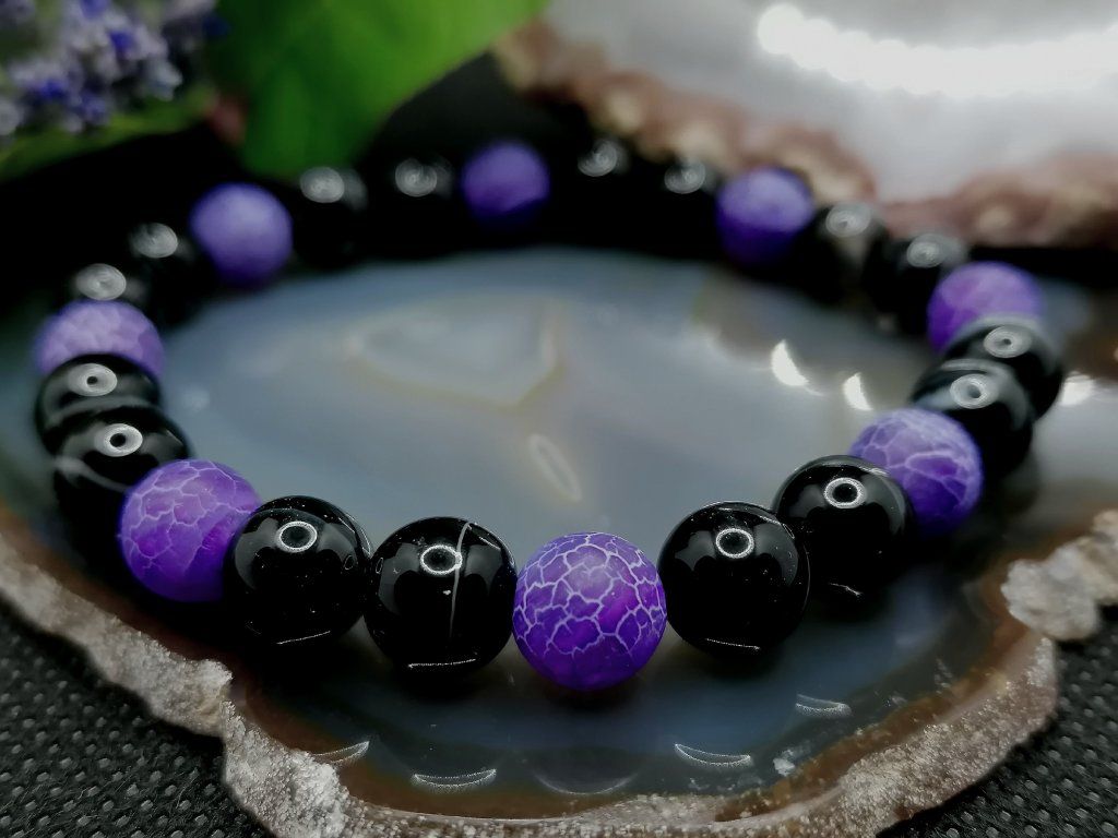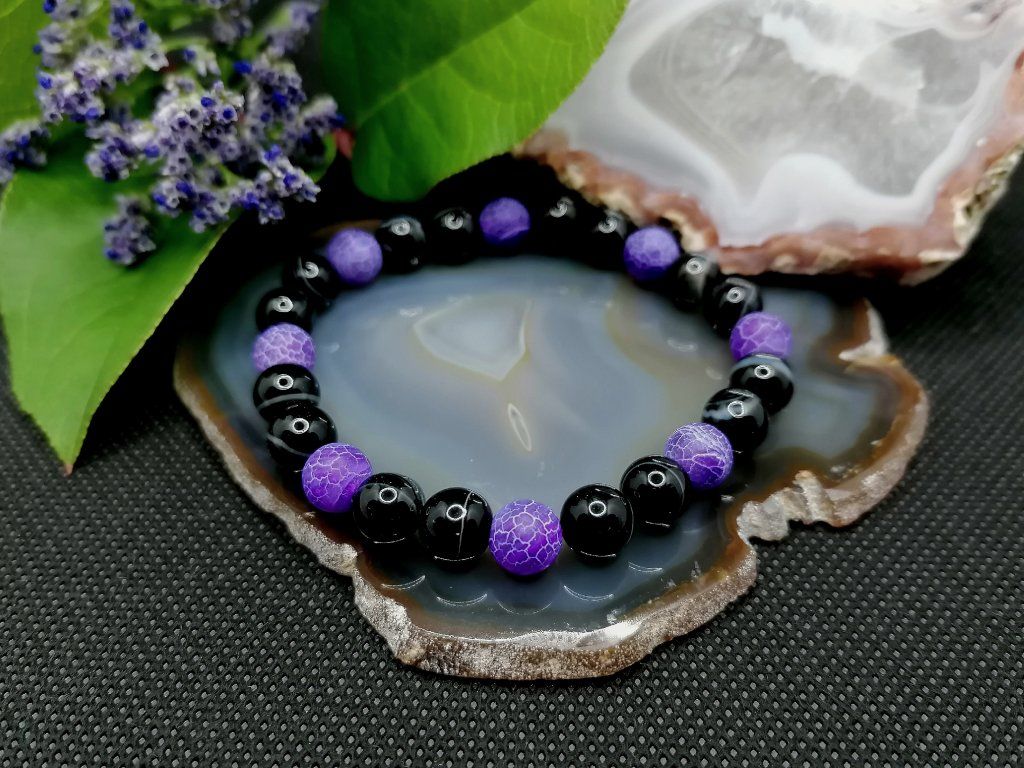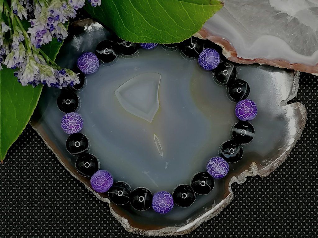 Tento náramek vás zaujme svou magickou kombinací sytě fialových a elegantních černých korálků s vysokým leskem. Fialový achát je spojován s duchovním růstem a intuicí, zatímco černý achát poskytuje silné uzemnění a ochranu před negativními vlivy okolí.
