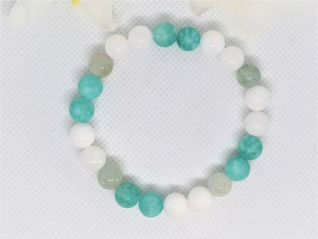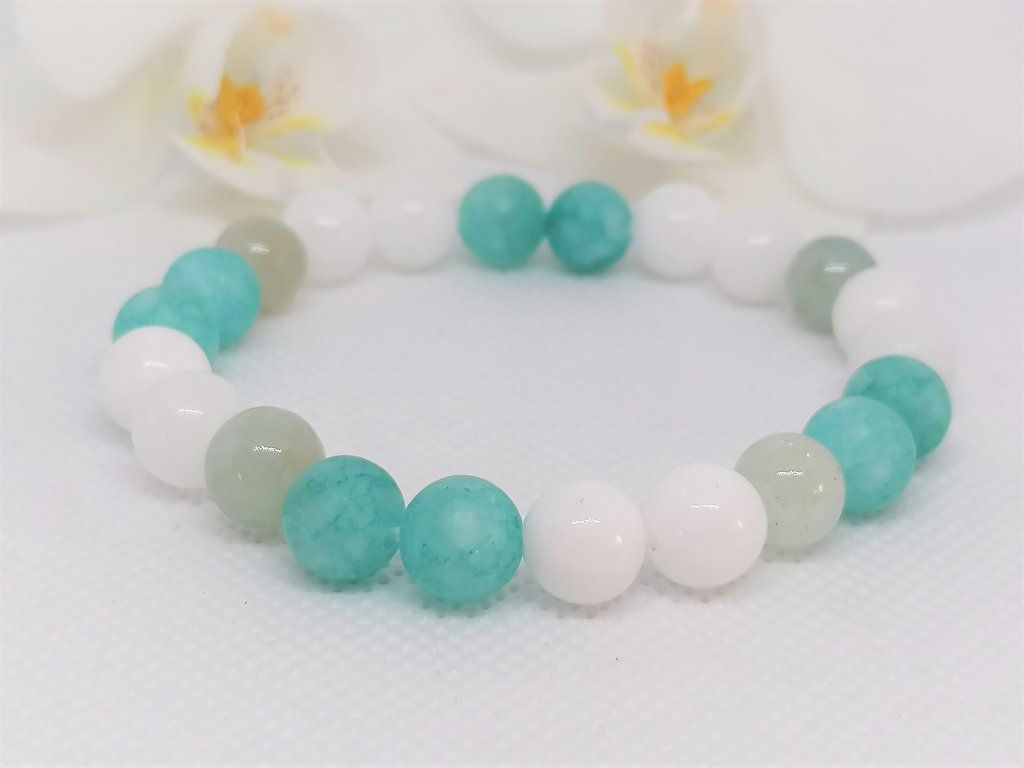 Náramek je vizuálně velmi svěží díky souhře mléčně bílých tónů a matných tyrkysových odstínů, které doplňují průzračnost akvamarínu. Působí velmi čistě a elegantně, což z něj dělá dokonalý doplněk pro každou ženu, která chce podpořit svou intuici, rozvahu a vnitřní mír.