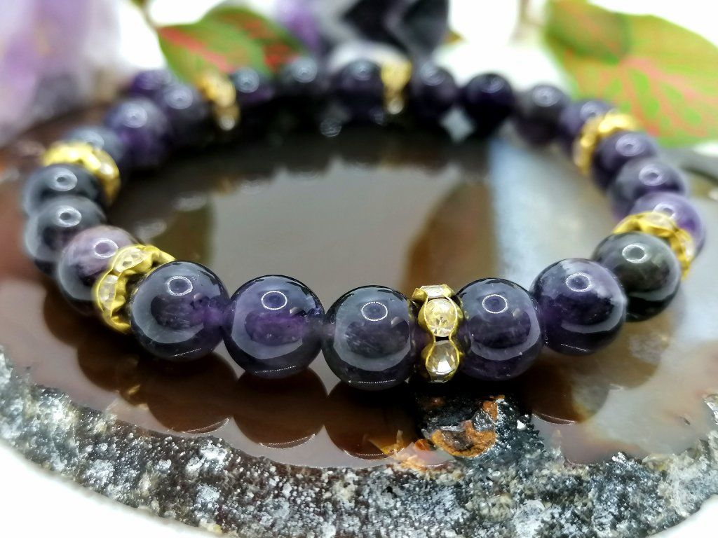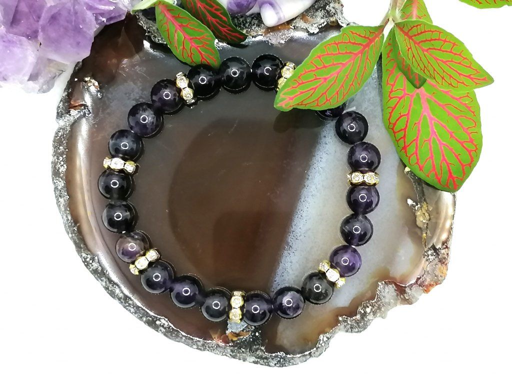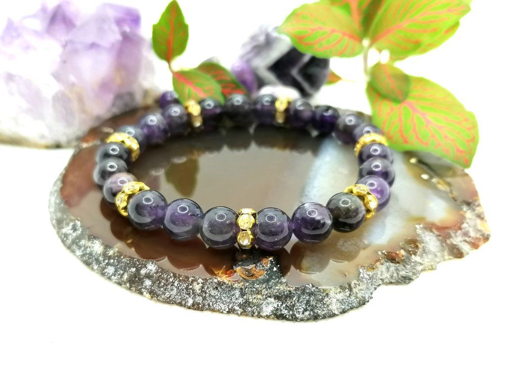Minerální náramek z ametystu, který spojuje vnitřní klid a sílu s oslnivou elegancí. Temně fialové korálky ametystu jsou doplněny zářivými zlatými mezidíly a třpytivými štrasovými rondelkami, které náramku dodávají exkluzivní vzhled. Pomáhá zklidnit mysl, podporuje intuici a projasňuje auru. Navlečeno na kvalitní pružence pro pohodlné nošení.