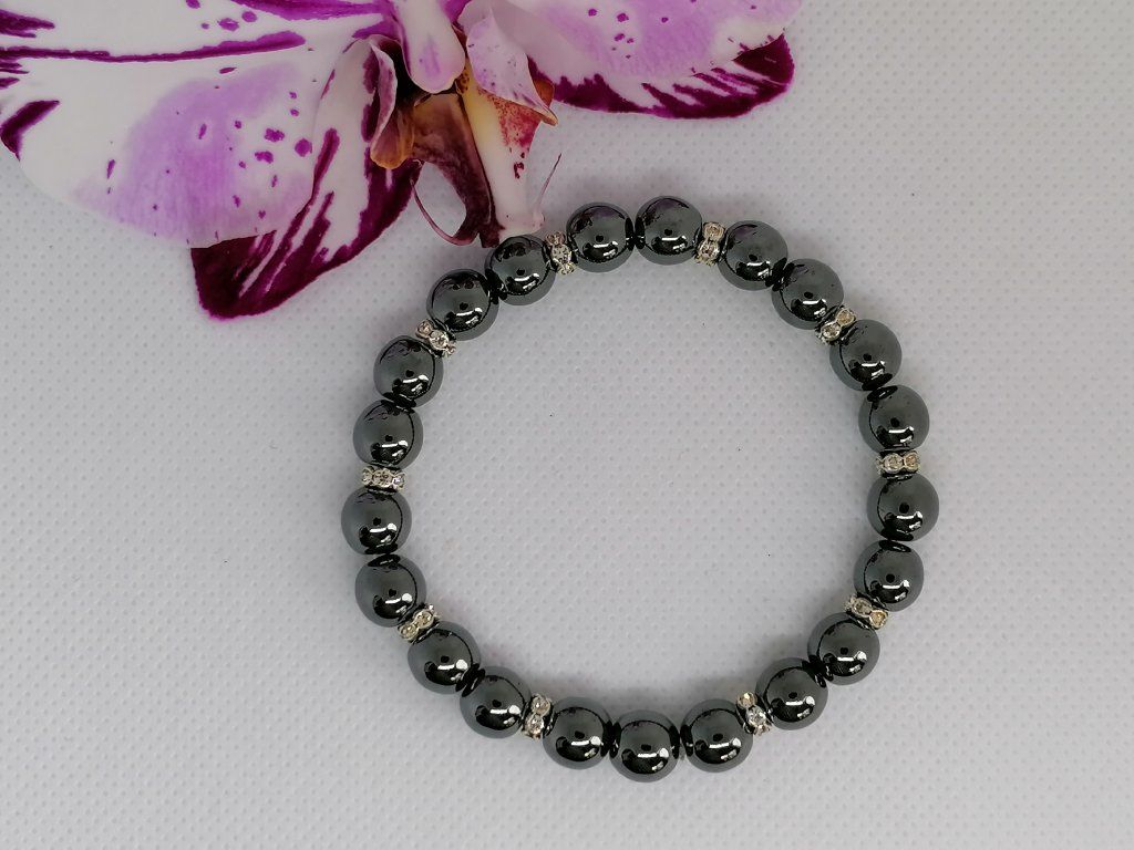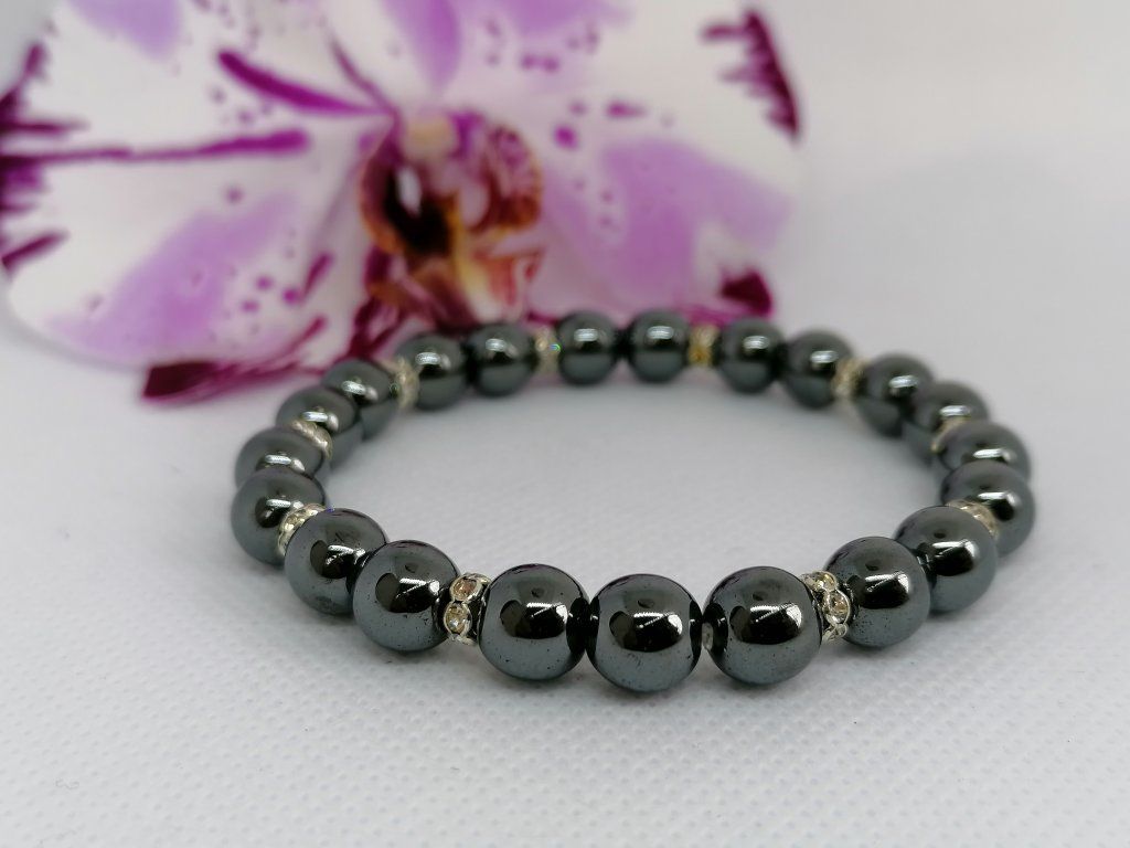 Minerální náramek z hematitu doplněný elegantními kovovými rondelkami ve stříbrné barvě. Hematit je kamenem stability, síly a ochrany, který pomáhá uzemnit mysl a dodává vnitřní klid v náročných dnech. Přírodní korálky jsou navlečené na pružence pro pohodlné a snadné nošení.