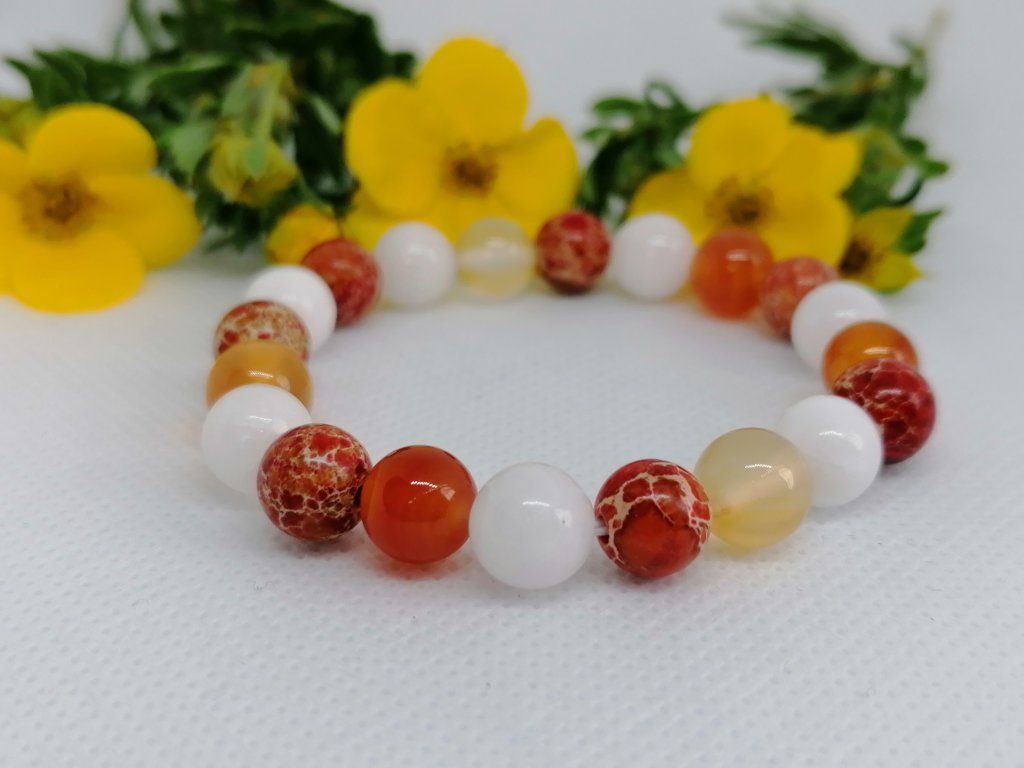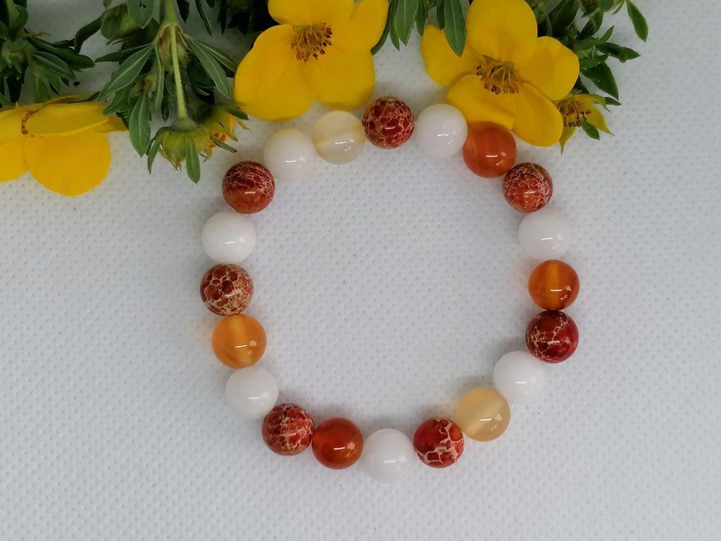Náramek vás na první pohled zaujme svou pestrou hrou barev – od jemně mléčných tónů jadeitu přes sytě oranžovo-červený karneol až po přírodně strukturovaný jaspis. Díky vysokému lesku korálků působí náramek velmi luxusně a stane se vaším nepostradatelným doplňkem, který vás nabije pozitivní energií.