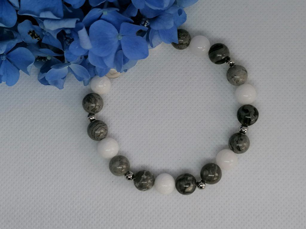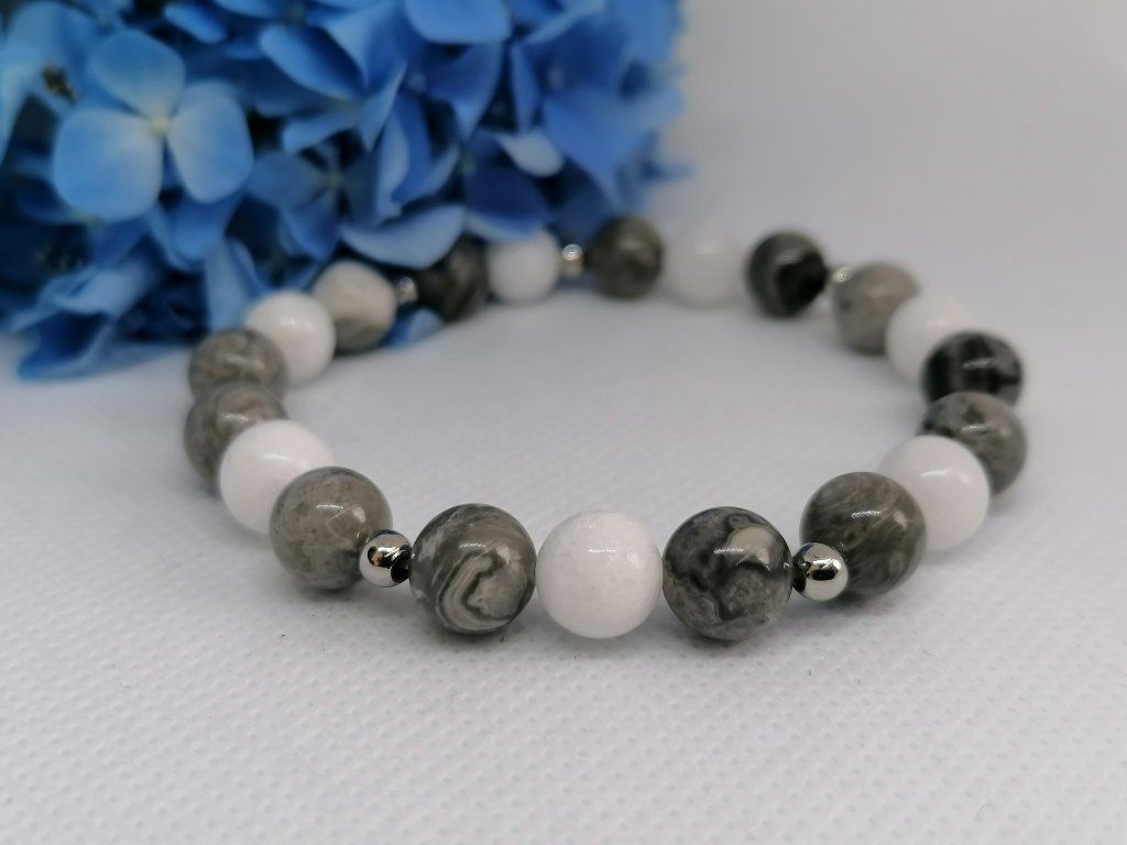 Elegantní minerální náramek kombinující čistotu bílého jadeitu a unikátní kresbu šedého jaspisu. Tato souhra minerálů přináší pocit hlubokého klidu, stability a vnitřní rovnováhy. Náramek je doplněn jemnými kovovými korálky ve stříbrné barvě, které podtrhují jeho moderní a minimalistický vzhled. Přírodní korálky jsou navlečené na pružence pro pohodlné a snadné nošení.