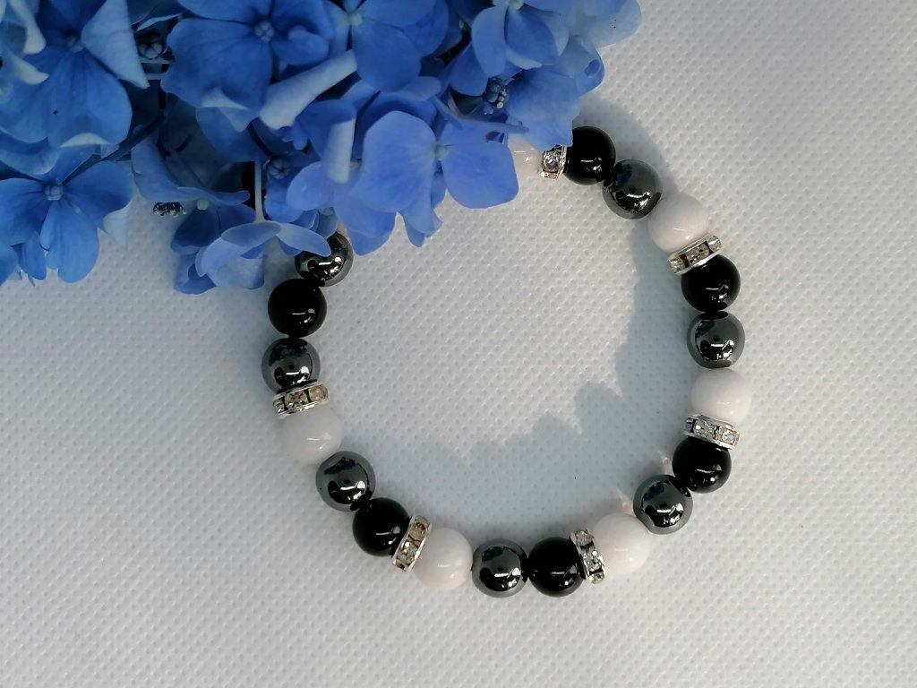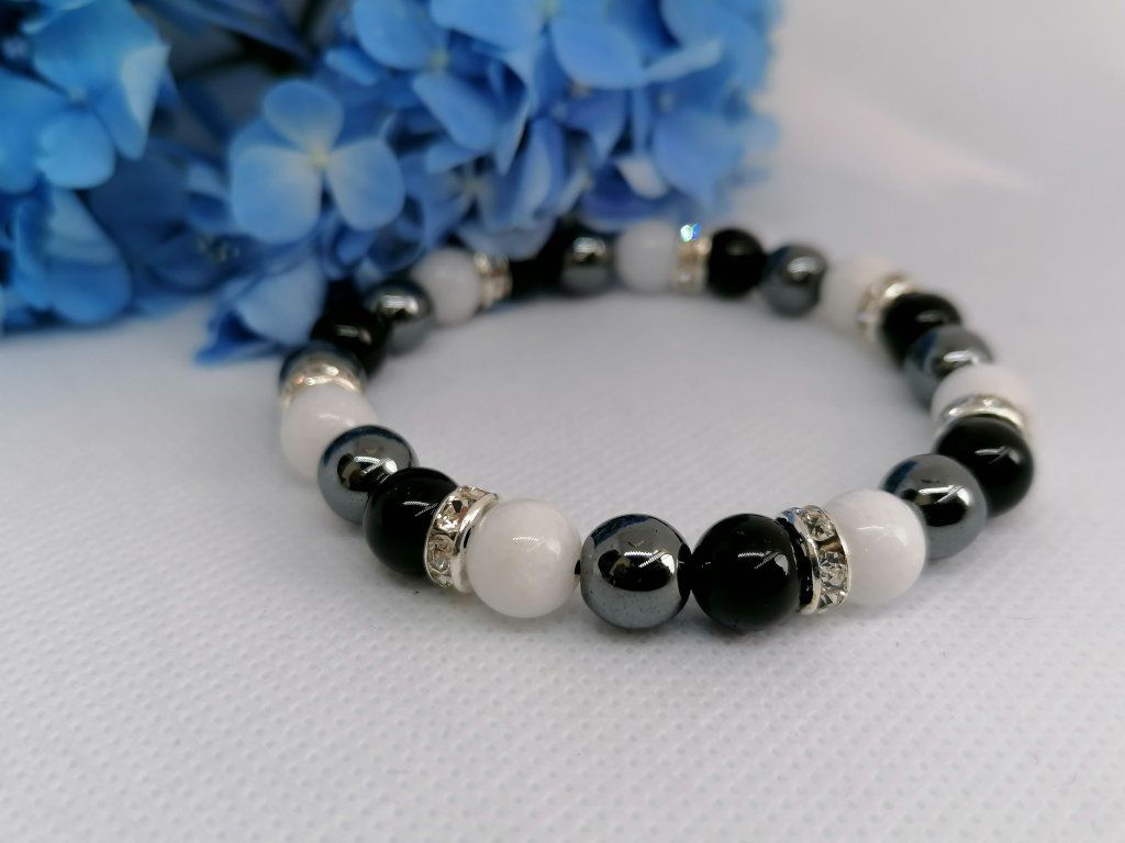 Pravidelné střídání barev je oživeno stříbrnými štrasovými rondelkami. Broušené skleněné krystaly (šatony) v rondelkách zachycují světlo a vytvářejí nádherné odlesky, které kontrastují s matnějším povrchem kamenů. Náramek je díky své barevnosti (černá, bílá, šedá) nesmírně univerzální a stane se vaším oblíbeným doplňkem pro každou příležitost.