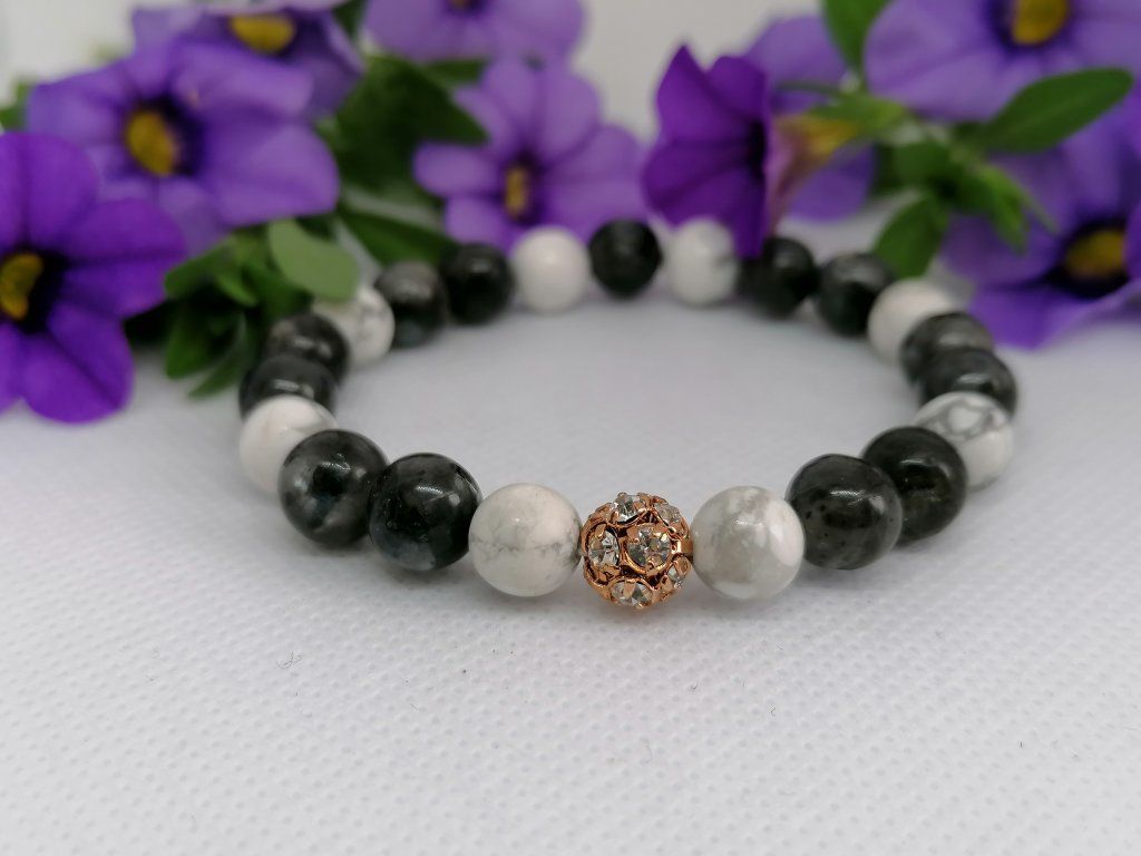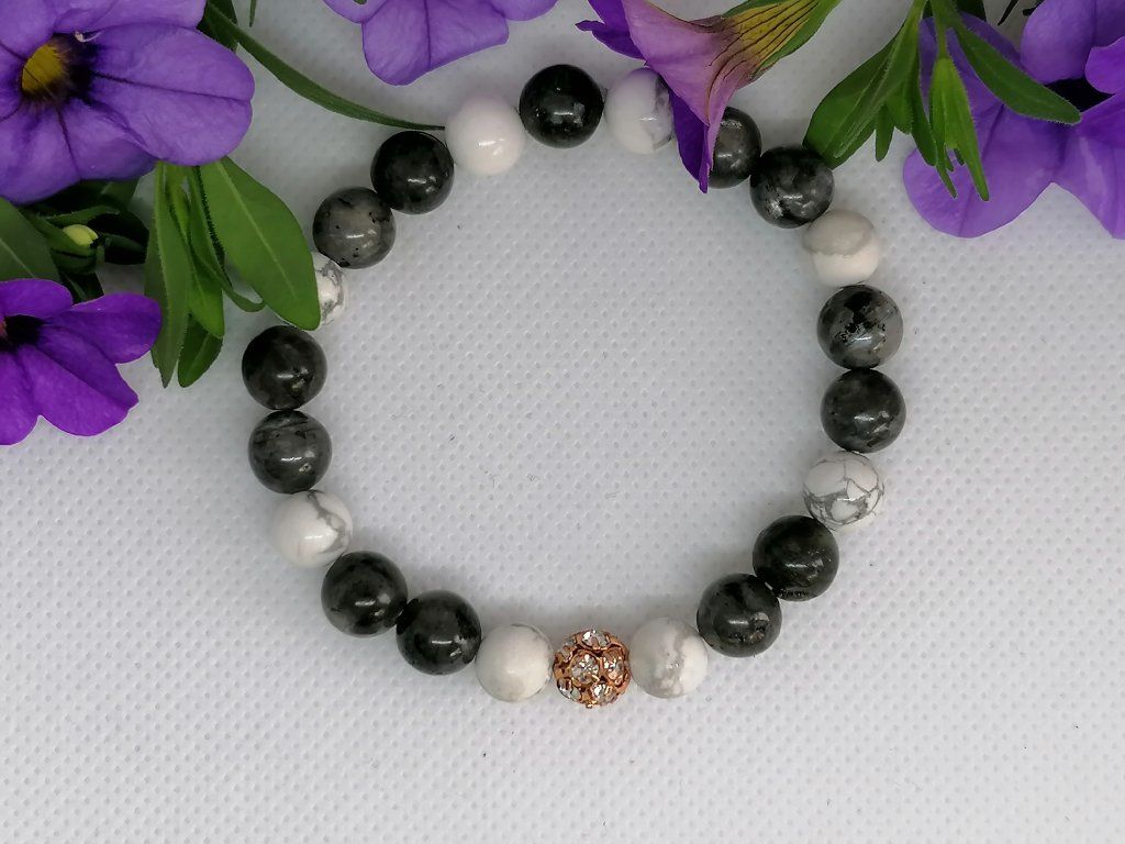 Elegantní minerální náramek kombinující mystický labradorit a uklidňující magnezit. Tato souhra minerálů přináší ochranu, vnitřní klid a podporuje intuici. Náramek zdobí luxusní zlatá štrasová kulička osázená čirými skleněnými šatony, která náramku dodává oslnivý třpyt. Navlečeno na kvalitní pružence pro pohodlné nošení.