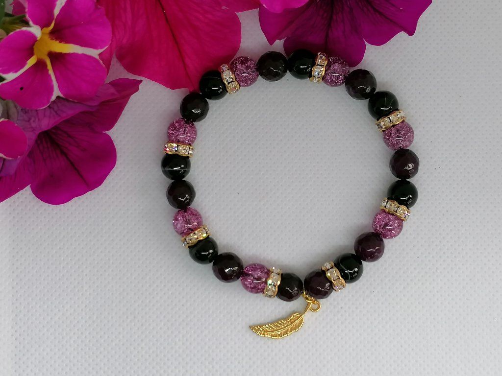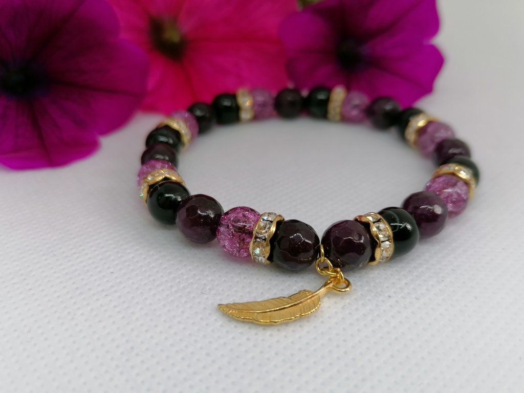 Exkluzivní minerální náramek tvořený harmonickou kombinací černého achátu, fialového nefritu a praskaného křišťálu. Tento šperk je symbolem vnitřní síly, intuice a duchovní rovnováhy. Ústředním prvkem je přívěsek ve tvaru pírka, vyrobený ze stříbra Ag 925/1000 a pozlacený 24k zlatem. Celkový luxusní vzhled podtrhují zlaté štrasové rondelky. Navlečeno na kvalitní pružence.