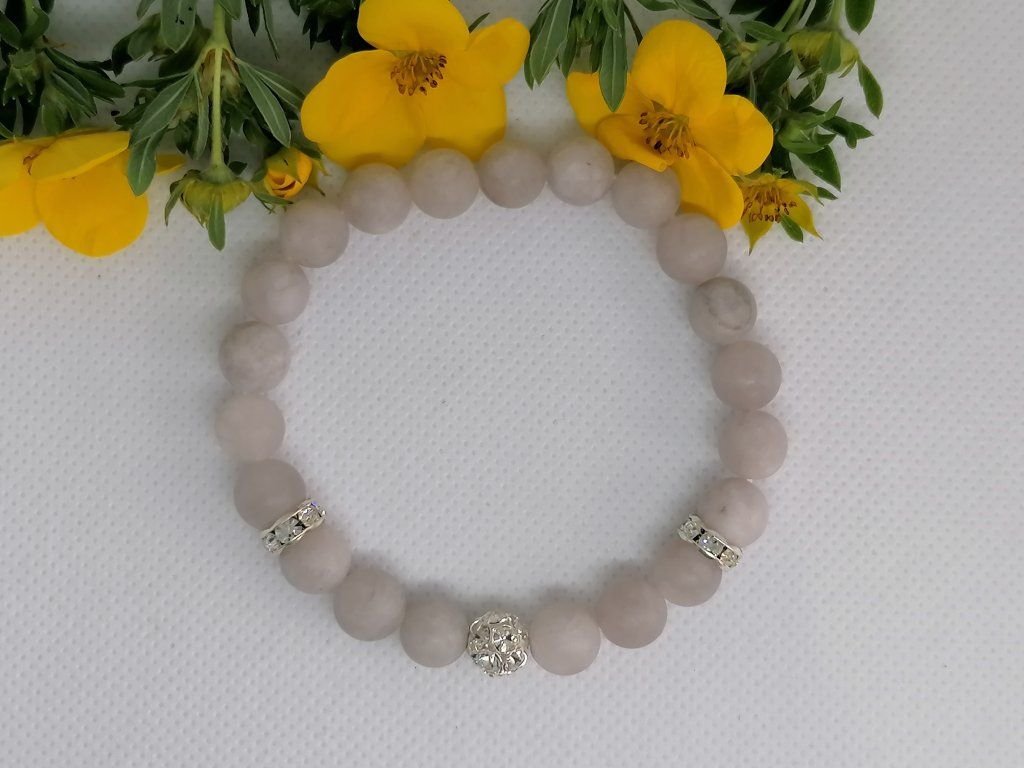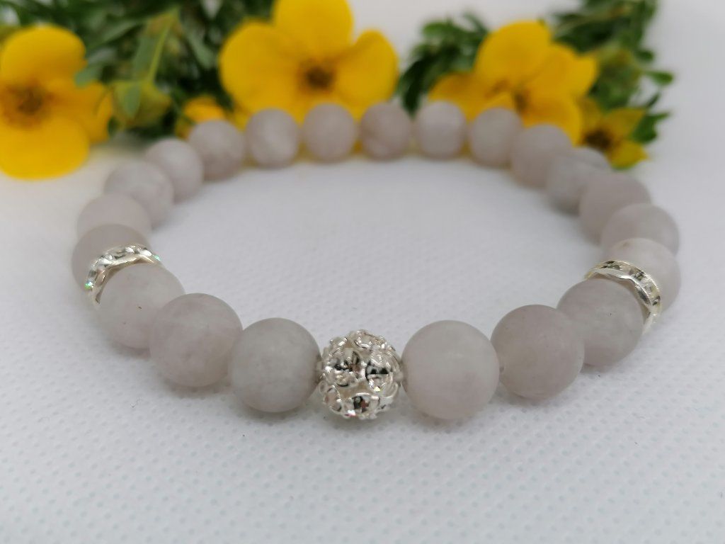 Jemný minerální náramek z nefritu, který je symbolem čistoty, klidu a harmonie. Tento náramek v světle šedém odstínu je doplněn stříbrnou štrasovou kuličkou a dvěma štrasovými rondelkami, které jsou osázeny čirými skleněnými šatony. Tato kombinace dodává šperku oslnivý třpyt a nádech luxusu. Navlečeno na kvalitní pružence pro pohodlné nošení.