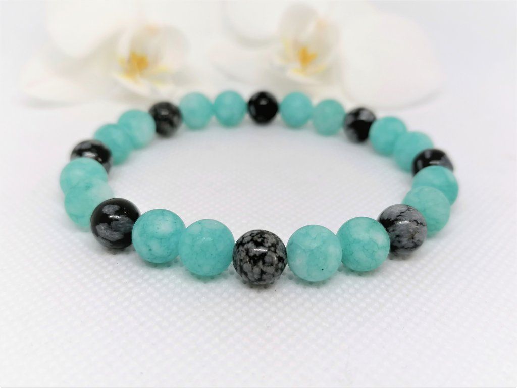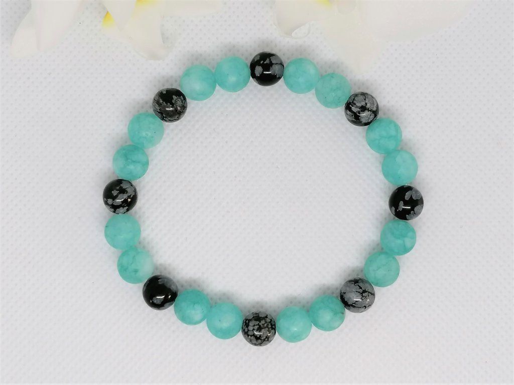 Objevte sílu dvou kamenů, které se vzájemně dokonale doplňují. Vločkový obsidián je kamenem sebedůvěry a čistoty; jeho bílé skvrnky připomínající sněhové vločky vnášejí světlo do temnoty a pomáhají nám vidět věci takové, jaké skutečně jsou. Jadeit k této síle přidává jemnost a stabilitu. Je to kámen, který vnáší do duše mír, podporuje láskyplné emoce a chrání před neklidem.