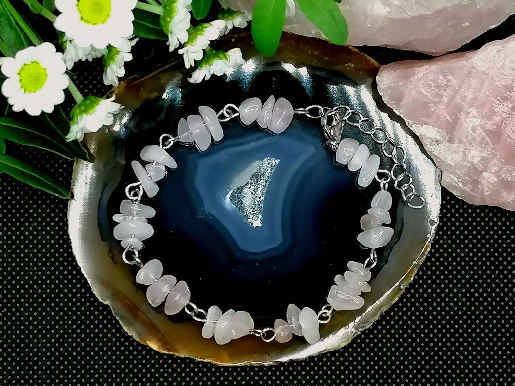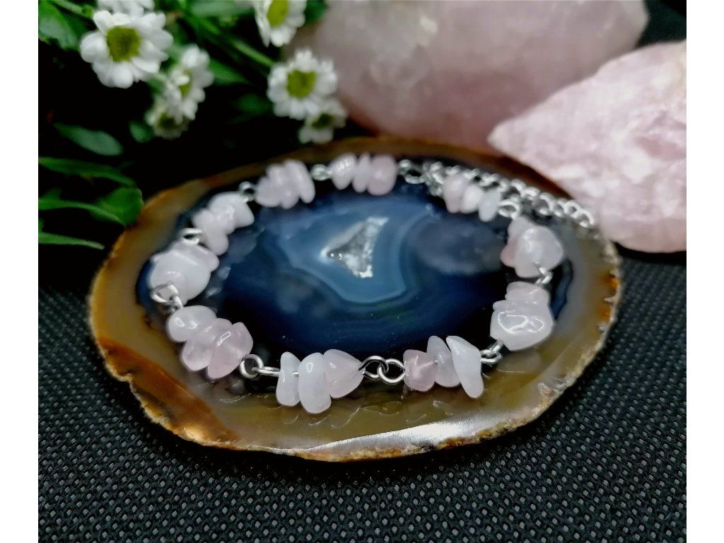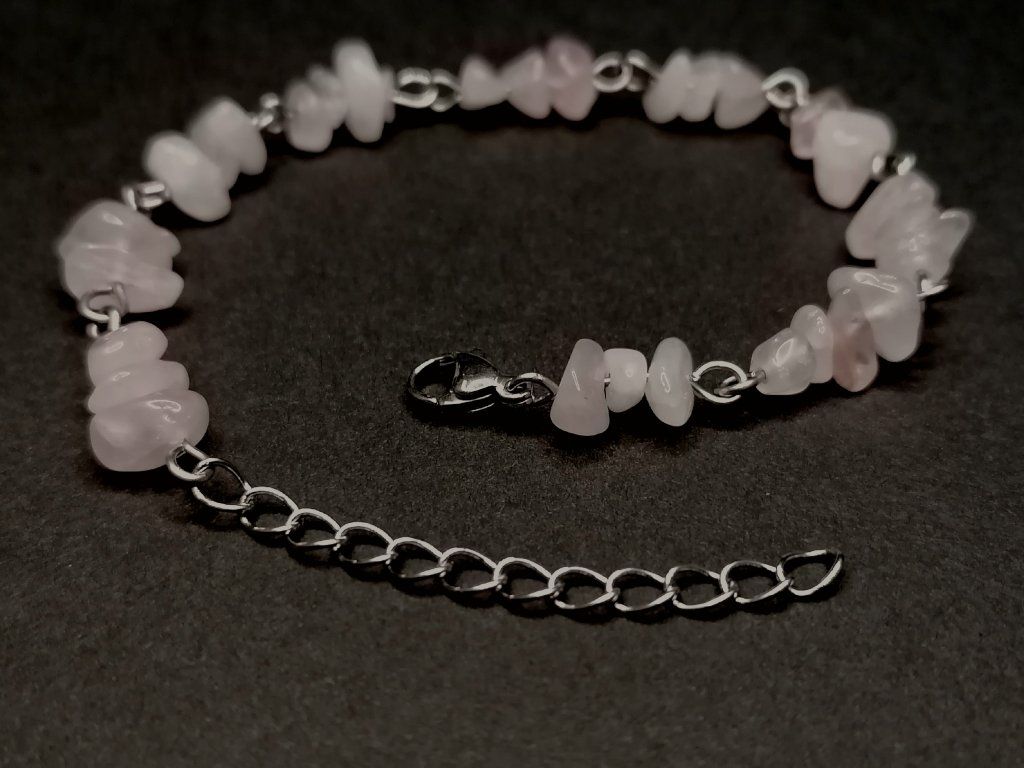 Jemný náramek z nepravidelných zlomků růženínu, které jsou ručně pospojovány očky z chirurgické oceli. Elegantní a lehký šperk, který díky prodlužovacímu řetízku padne každému.