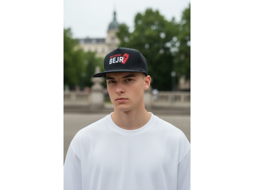 Stylová kšiltovka Psychopata Bejra s rovným kšiltem, nastavitelnou velikostí a logem Bejrova světa. Kvalitní 100% bavlna, ideální pro fanoušky, kteří chtějí výrazný a moderní look.