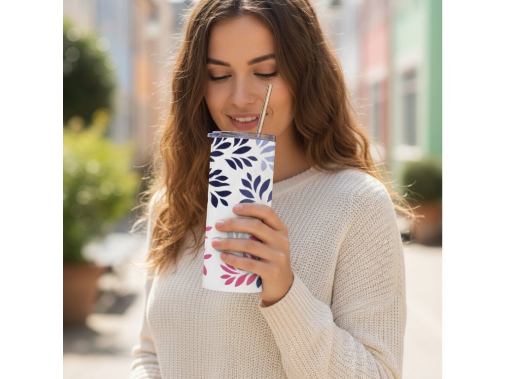 Jemný motiv lístků v kombinaci modrých, růžových a šedých tónů dodává kelímku svěží a nadčasový vzhled. Skvěle se hodí jako praktický doplněk i milý dárek.